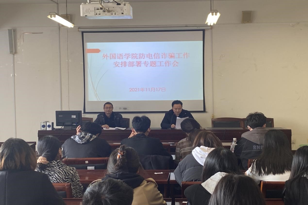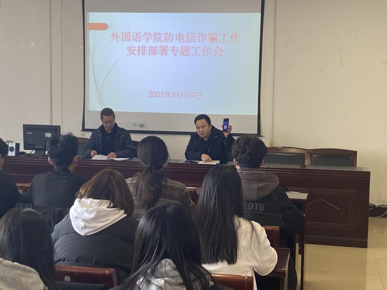 2021年11月17日下午,国产va无马网站在10号楼205会议室召开防电信诈骗安排部署专题会议,党总支书记郭强主持会议,副书记王体、全体辅导员及国产va无马网站各班长30余位参加会议。