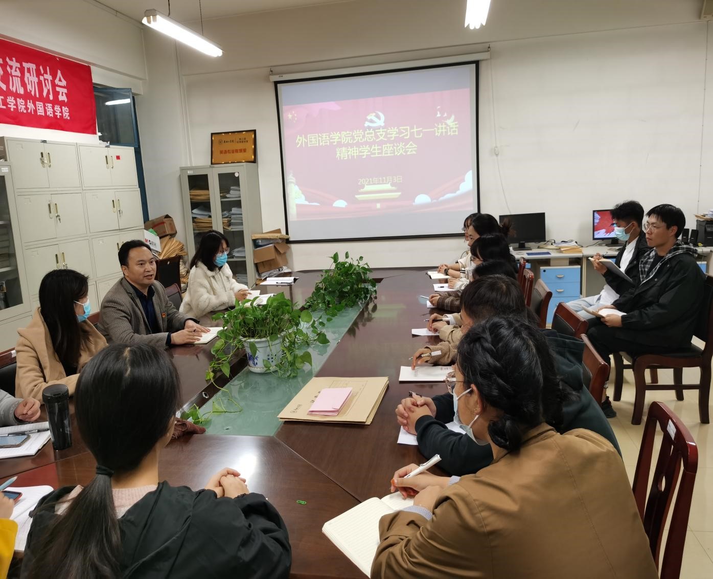 2021年11月3日下午,国产va无马网站党总支在10号楼201会议室召开七一讲话精神学生座谈会,党总支副书记王体主持会议,全体辅导员及20余位学生代表参加此次座谈。