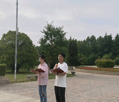 校国旗护卫队队嘹亮的口号,整齐的步伐,矫健的身姿,飒爽的风采展现了新时代大学生的良好风貌。伴着灿烂的旭日朝阳和激昂的国歌,国旗在全体师生的注目礼中缓缓升起。学生代表胡思怡进行了国旗下的演讲,号召青年学生要认真学习、正确认识党的光辉历史和伟大功绩,并永远铭记于心。学生刘琳堃、张怡进行了诗朗诵《红船,从南湖起航》,带同学们回顾了党领导人民努力奋进的光辉历程,表达了青年学子立志报国的远大理想。