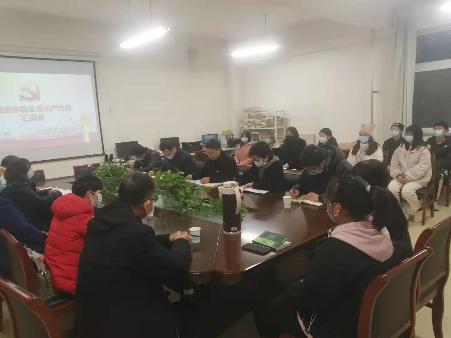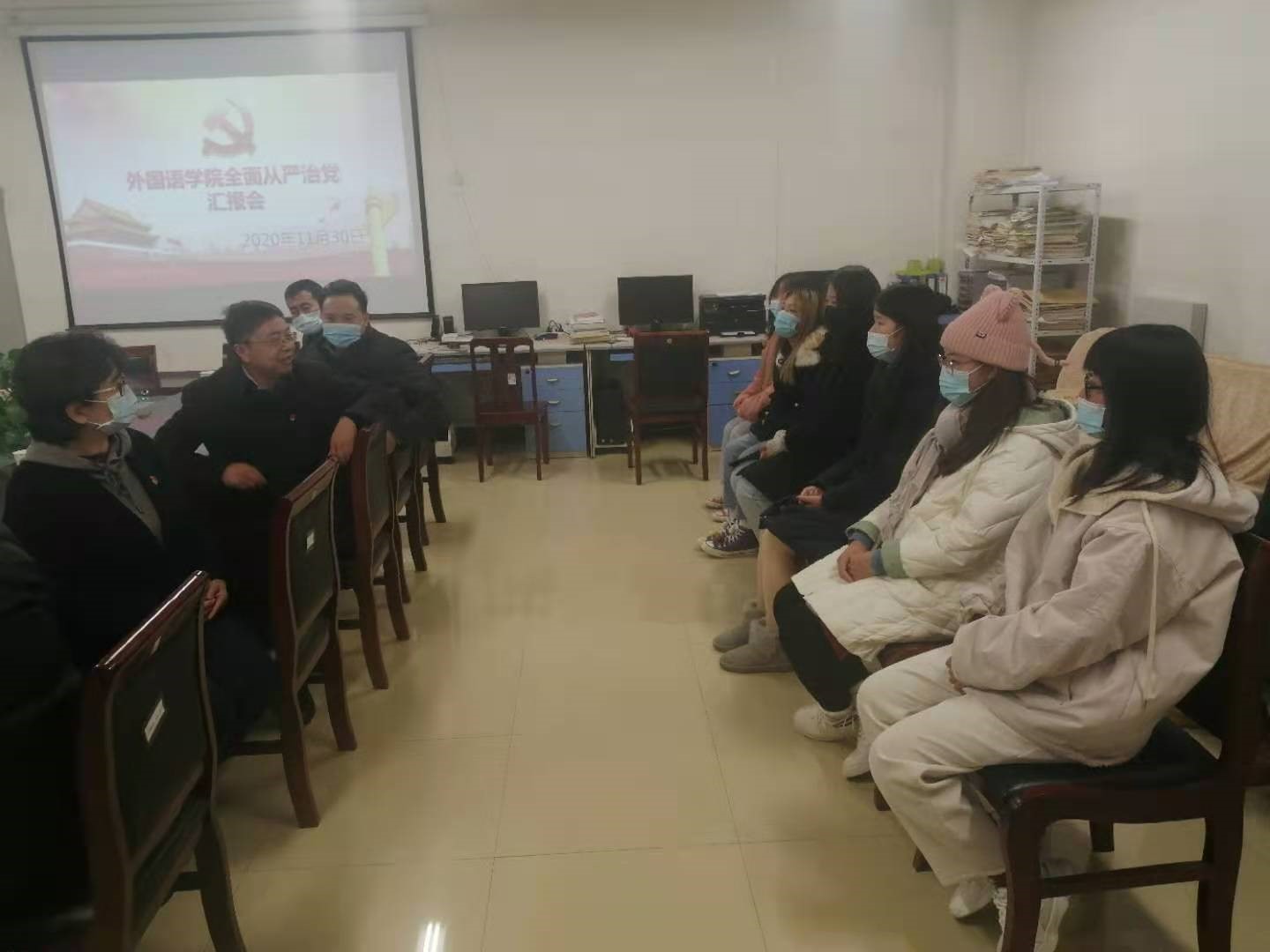 11月30日下午,副校长万鹏杰到国产va无马网站调研指导全面从严治党工作,并与所联系的党支部和班级师生代表进行座谈。汇报座谈会在A10-201进行,国产va无马网站领导班子成员、英语教研室党支部全体党员、20级英语专业2班学生代表等30余人参加会议。