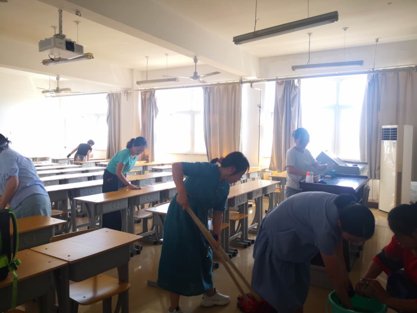 大家兴致勃勃地奔向任务教室,他们拖地板、擦拭窗台、开窗通风、对教学场所进行消毒。经过打扫,A10的语音实验室101、104、105、107、110和教室603、604、605、606、607、608、609,东配楼的教室201、202、203、301、302、401、403、501、503、601、603、704,共计24个教室和语音室焕然一新。