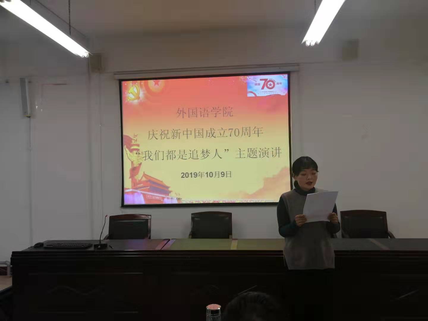 为了庆祝新中国成立70周年,结合“不忘初心、牢记使命”主题教育,10月9日下午,国产va无马网站在A10-205举行了“我们都是追梦人”庆祝新中国成立70周年主题演讲活动,全体教工党员参加。