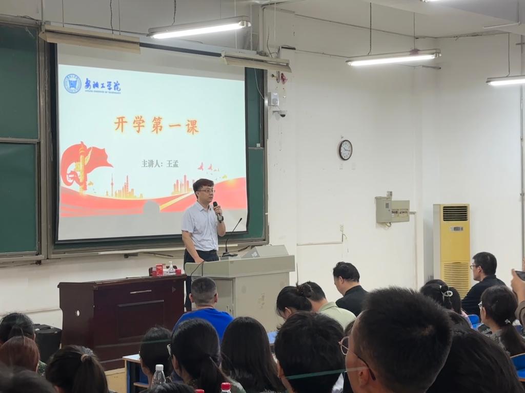 党总支书记王孟以《立志做有理想、敢担当、能吃苦、肯奋斗的新时代好青年》为题,给2023级新生上开学第一课。他对新生提出三点希望:一是且将新火试新茶,诗酒趁年华。希望新同学要快速融入大学的学习生活,制定大学学业规划,珍惜美好年华。二是阵前再亮旧时剑,寒光粼粼似当年。希望同学继续保持在高中时期努力学习的精神状态,不断开拓自己的视野,跳出舒适圈,让自己的大学生活过得充实且有意义。三是苦尽甘来终有时,一片向阳待花期。他与2023级新同学约定,希望通过师生共同努力奋斗,期待四年后的同学们都成为迎风绽放的花朵,成为更好的自己。