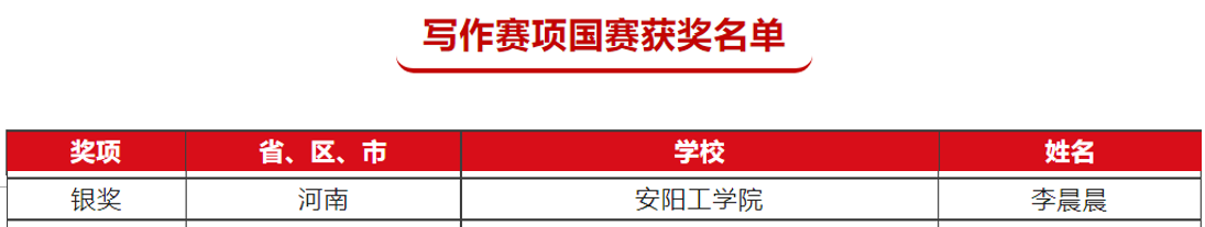 近日,2023“外研社·国才杯”“理解当代中国”全国大学生外语能力大赛(英语组)阅读、写作、笔译系列赛事圆满结束。在刘晓玲老师、张欣老师、沙莎老师的指导下,我院学生脱颖而出,获得河南赛区写作大赛特等奖1项,阅读大赛一等奖1项、二等奖1项,笔译大赛一等奖1项。其中,河南赛区写作大赛特等将获得者、英语专业21级学生李晨晨同学晋级英语写作大赛全国总决赛,并以出色的表现斩获国赛银奖。